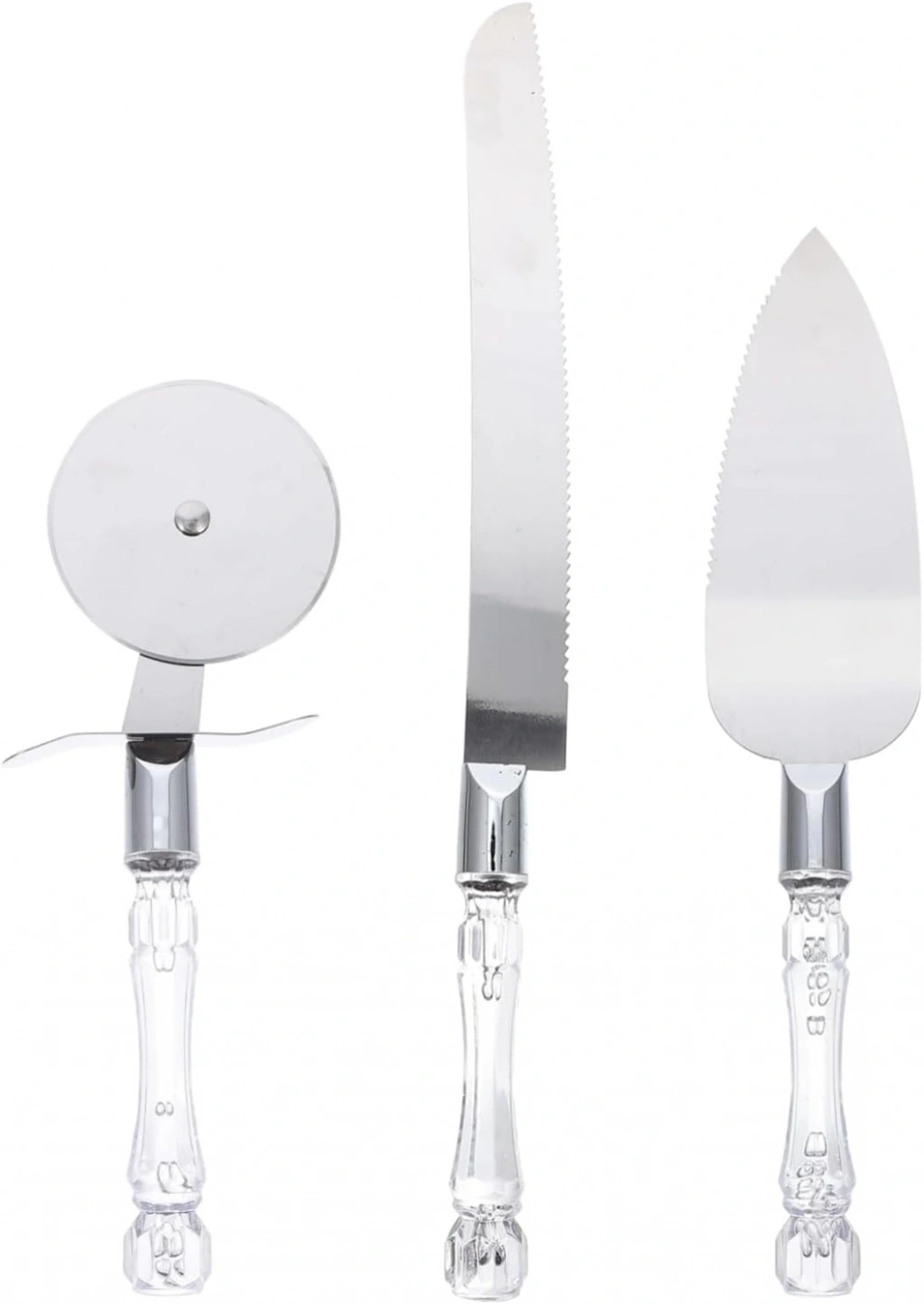 3 PARÇA SERVİS SETİÜrün Özellikleri3 Parça Servis Seti, şeffaf sap tasarımı ve paslanmaz metal yüzeyleriyle mutfakta estetik ve fonksiyonel kullanım sunar. Pizza kesme aparatı, uzun servis bıçağı ve geniş spatula içeren bu set; pizza, börek, pasta, kek ve tatlı servislerinde kesim ve sunumu kolaylaştırır. Keskin dişli bıçak pizza dilimlerini dağılmadan kesmenizi sağlarken spatula, dilimleri düzgün şekilde tabağa aktarmanıza yardımcı olur. Yuvarlak pizza kesici ise hamur ve pizza tabanlarında pratik kullanım imkânı sunar. Şeffaf sap detayları sofralarda zarif bir görünüm oluştururken dayanıklı yapısı uzun süreli kullanım sağlar. Günlük mutfak hazırlıklarından özel davet ve organizasyonlara kadar her ortamda kullanıma uygundur ve hijyenik ambalajıyla teslim edilir.Paket İçeriği1 Adet Pizza Kesici1 Adet Dişli Bıçak1 Adet Servis Spatulası