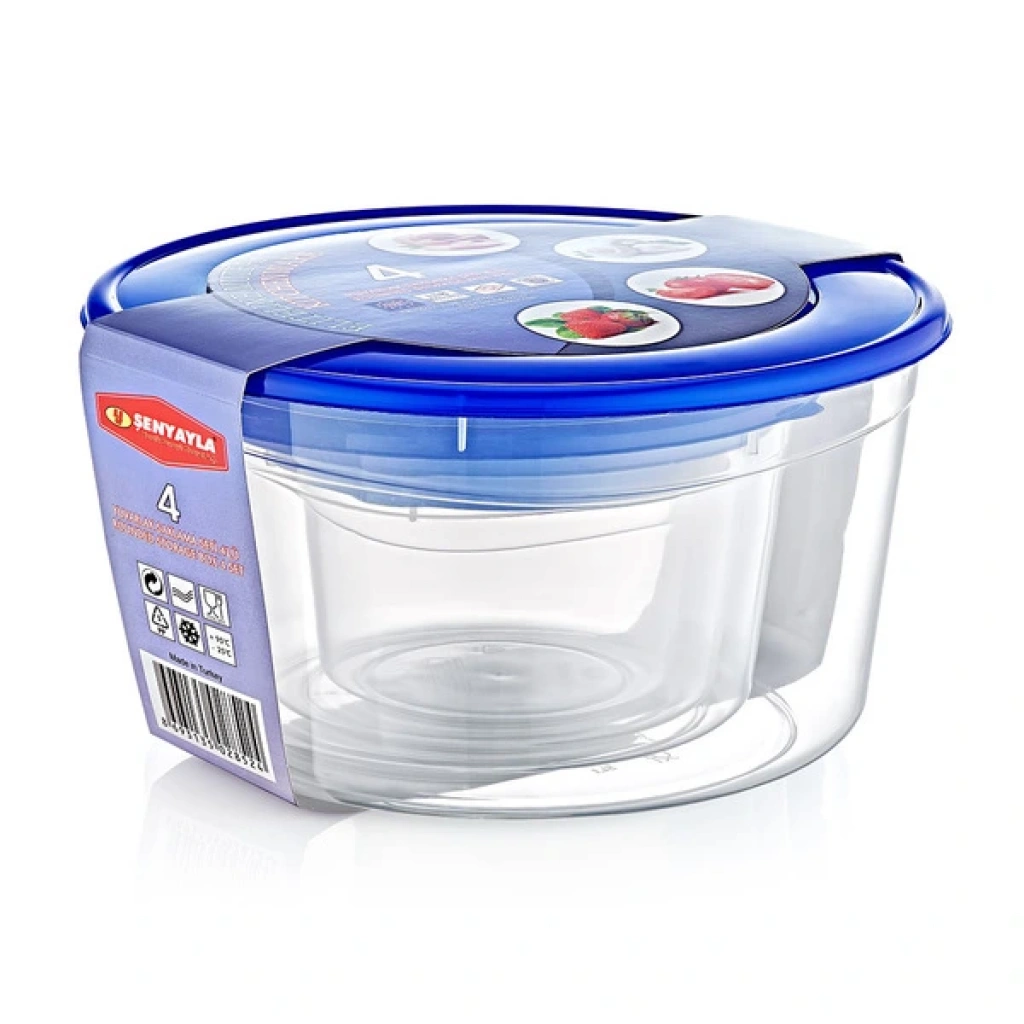 4'LÜ DERİN SAKLAMA KABI SETİÜrün ÖzellikleriMutfakta gıdalarınızı düzenli, hijyenik ve taze bir şekilde saklamak için tasarlanan 4’lü Derin Saklama Kabı Seti, farklı boyutları sayesinde hem sıvı hem de katı gıdalar için çok yönlü kullanım imkânı sunar. Şeffaf gövdesiyle içerisindeki yiyecekleri kolayca görebilirsiniz.Her kap, hava geçirmez ve sızdırmaz mavi kapağı sayesinde gıdaların tazeliğini korur. BPA içermeyen, dayanıklı plastikten üretilmiş olup gıda ile temasa uygundur. Set, salata, çorba, kahvaltılık, kuruyemiş veya yemek saklamak için idealdir. Ayrıca iç içe geçebilen yapısı sayesinde dolaplarda yer tasarrufu sağlar.Uzun ömürlü yapısı ve pratik kapak tasarımıyla buzdolabında, mutfak dolaplarında veya pikniklerde güvenle kullanılabilir.Paket İçeriği1 adet 4'lü Derin Saklama Kabı Seti